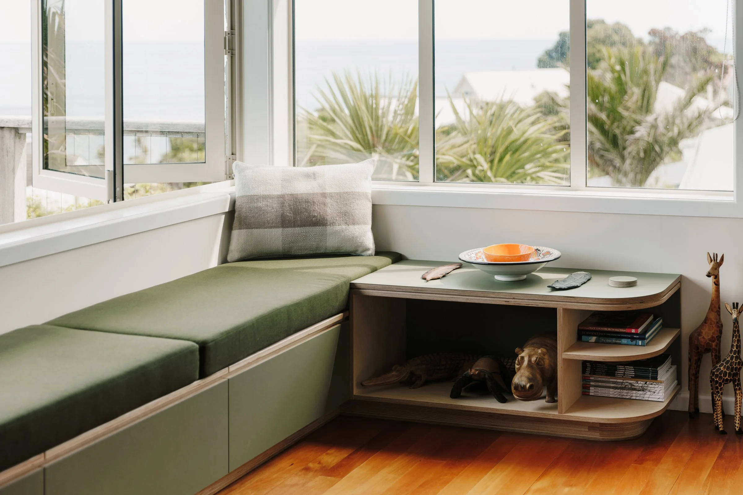 Working in with the existing style of the home, our crafted bench seat has been designed to be sleek and minimal so does not distract from the incredible ocean views. Many hours have been witled away here watching the local wildlife and weather.