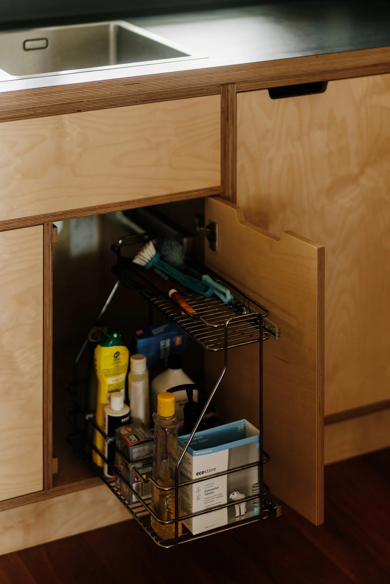 Under sink pull out detergent rack is a smart storage solution for organising cleaning supplies, with a stainless steel frame and baskets. Designed to clear door hinges when pulled out, it offers a 15kg load capacity for practical, everyday use.