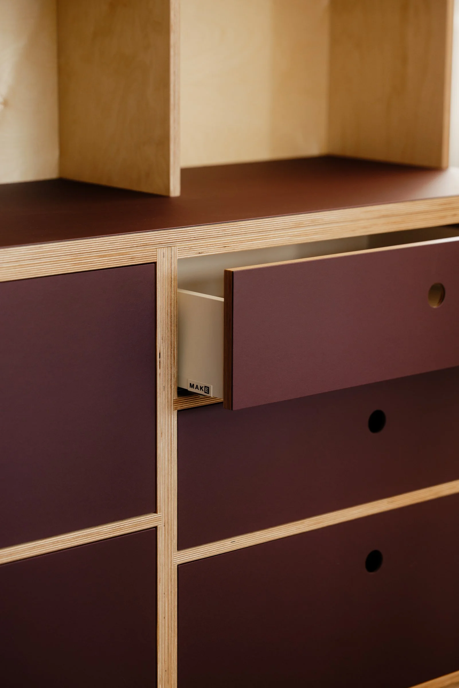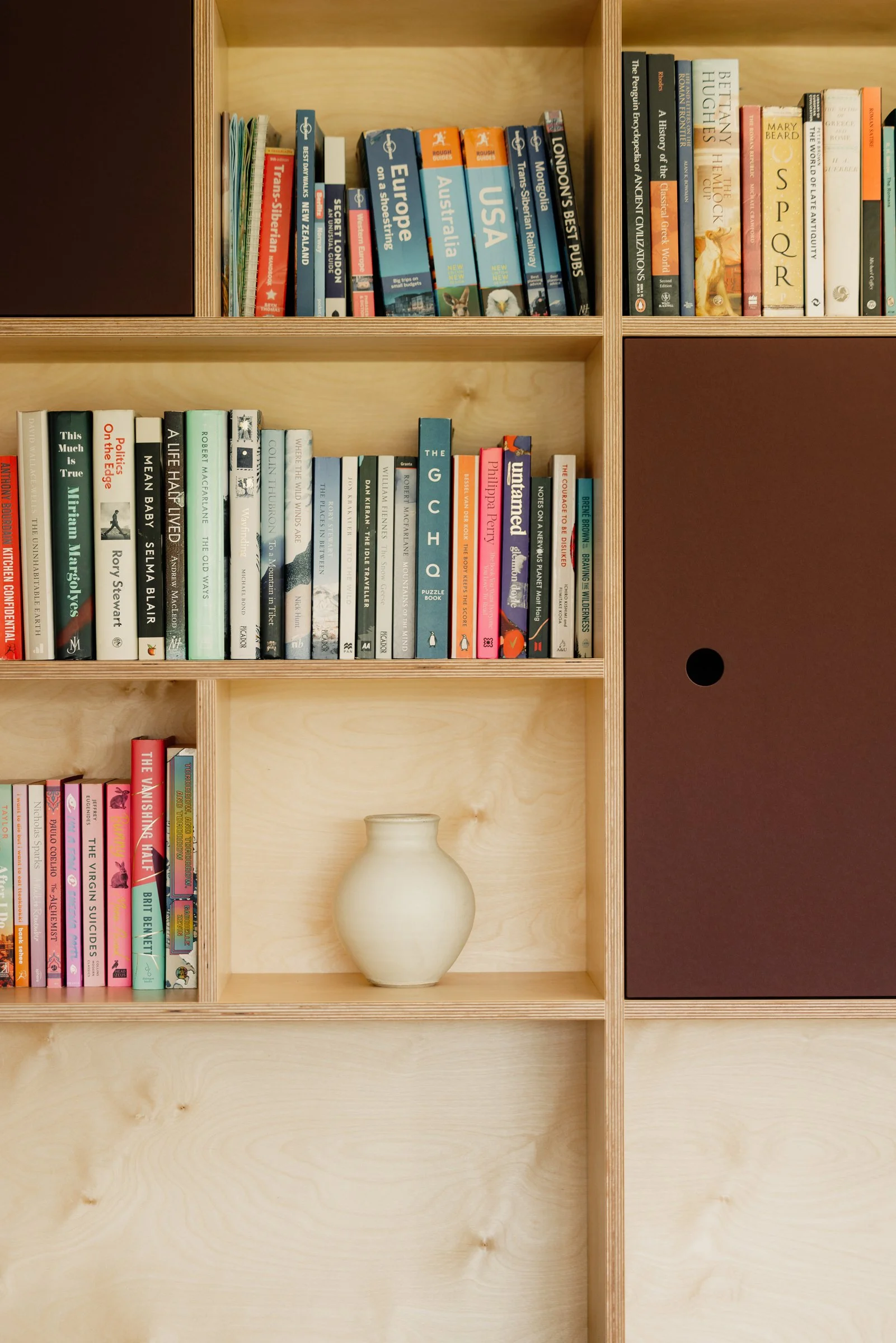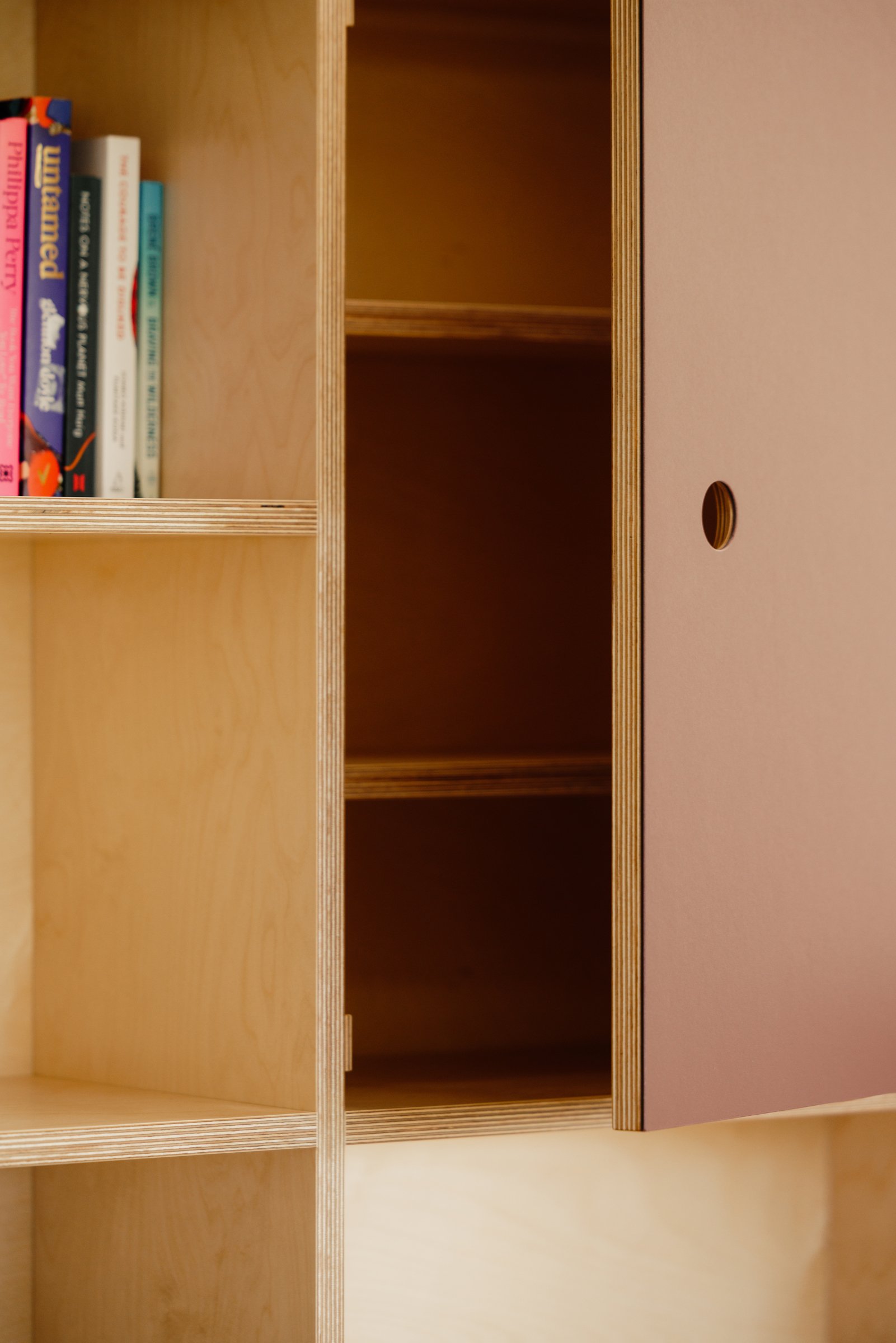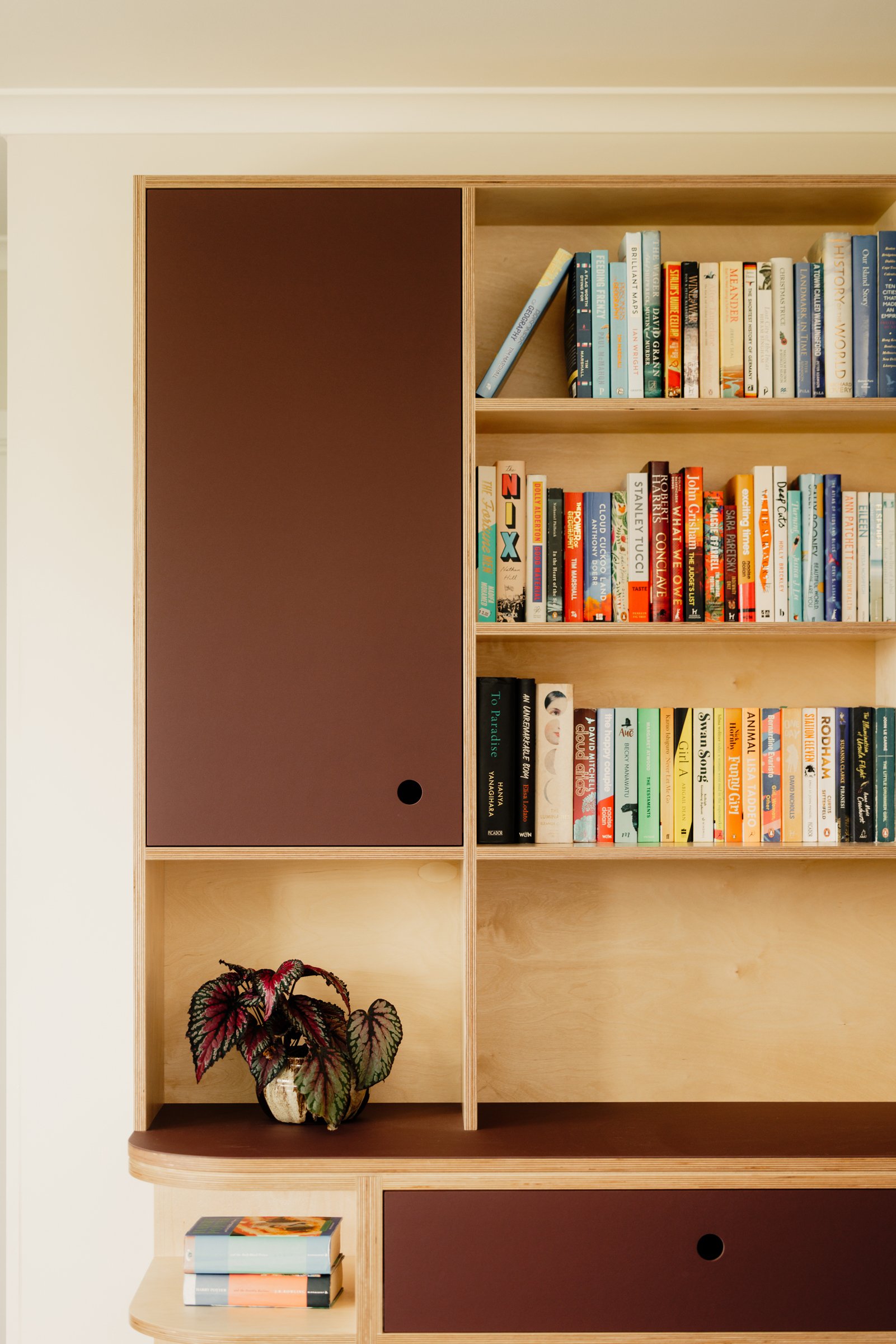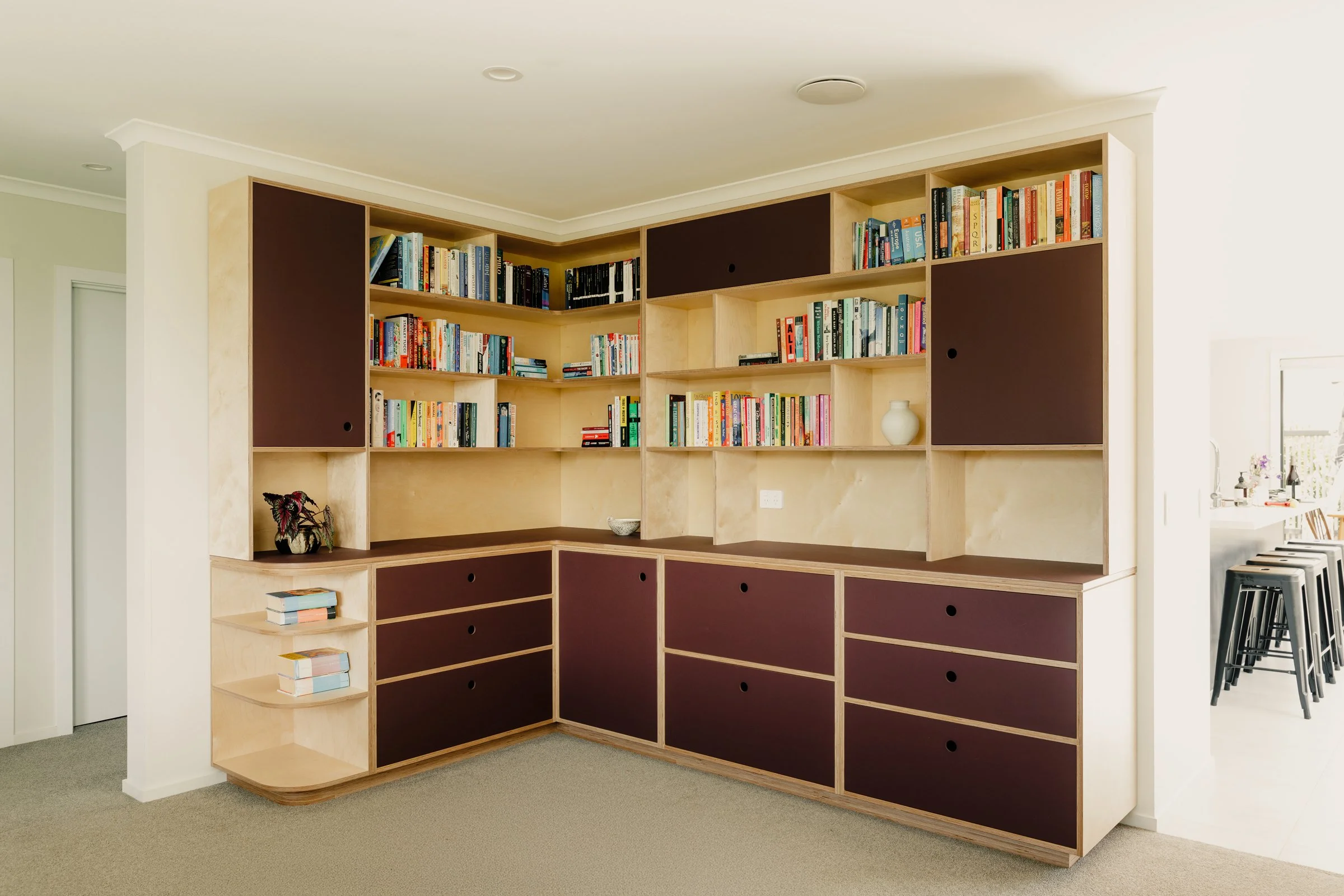 Open shelves to display the ample book collection, lots of drawers for the not so pretty bits and open shelves to soften the corner. Rich, berry coloured linoleum is the perfect contrast to the warmth of Birch plywood and creates depth for the corner.