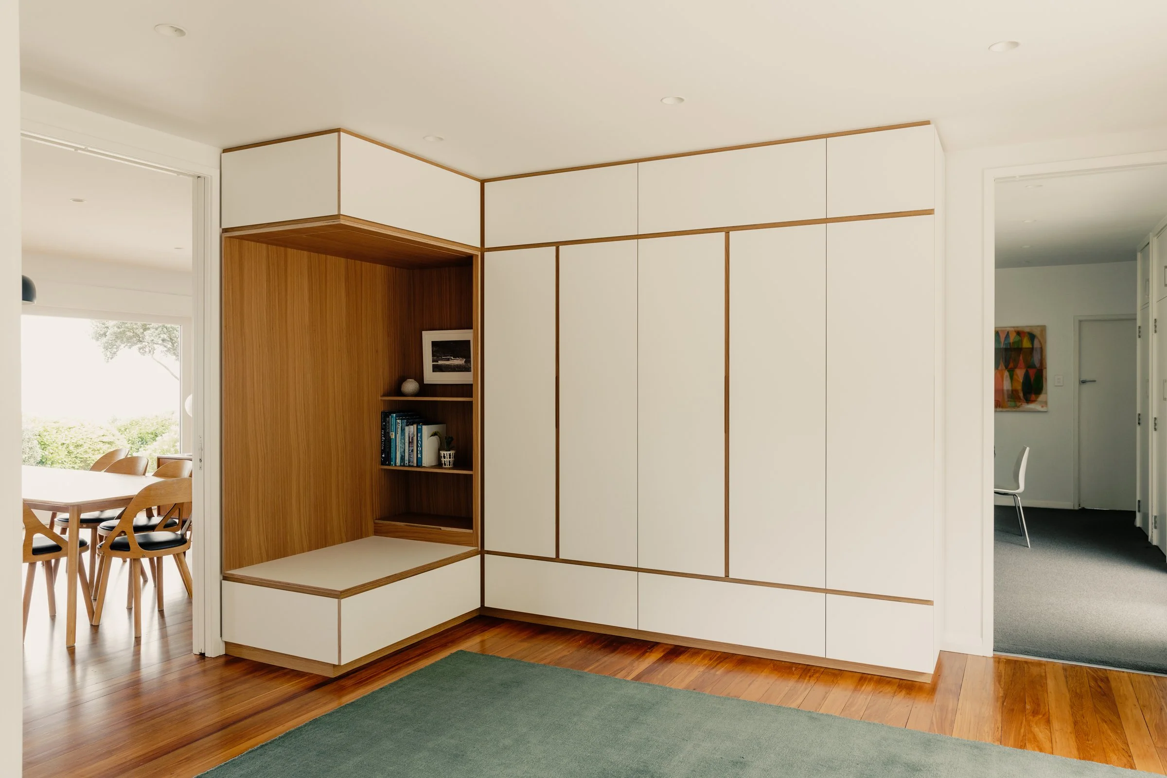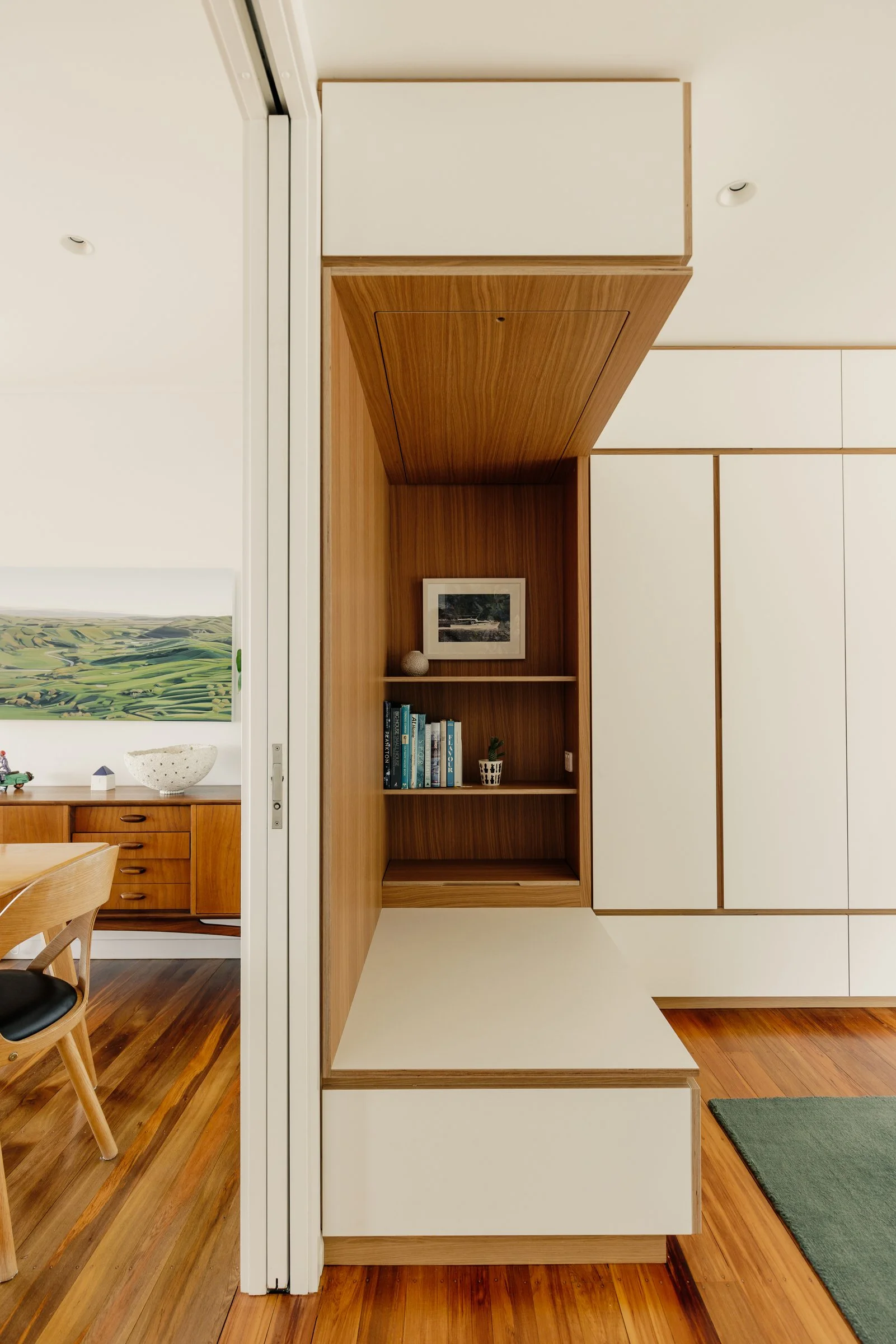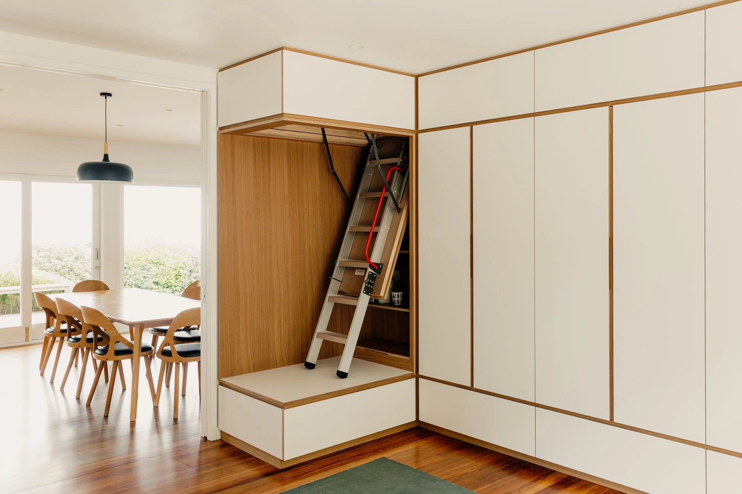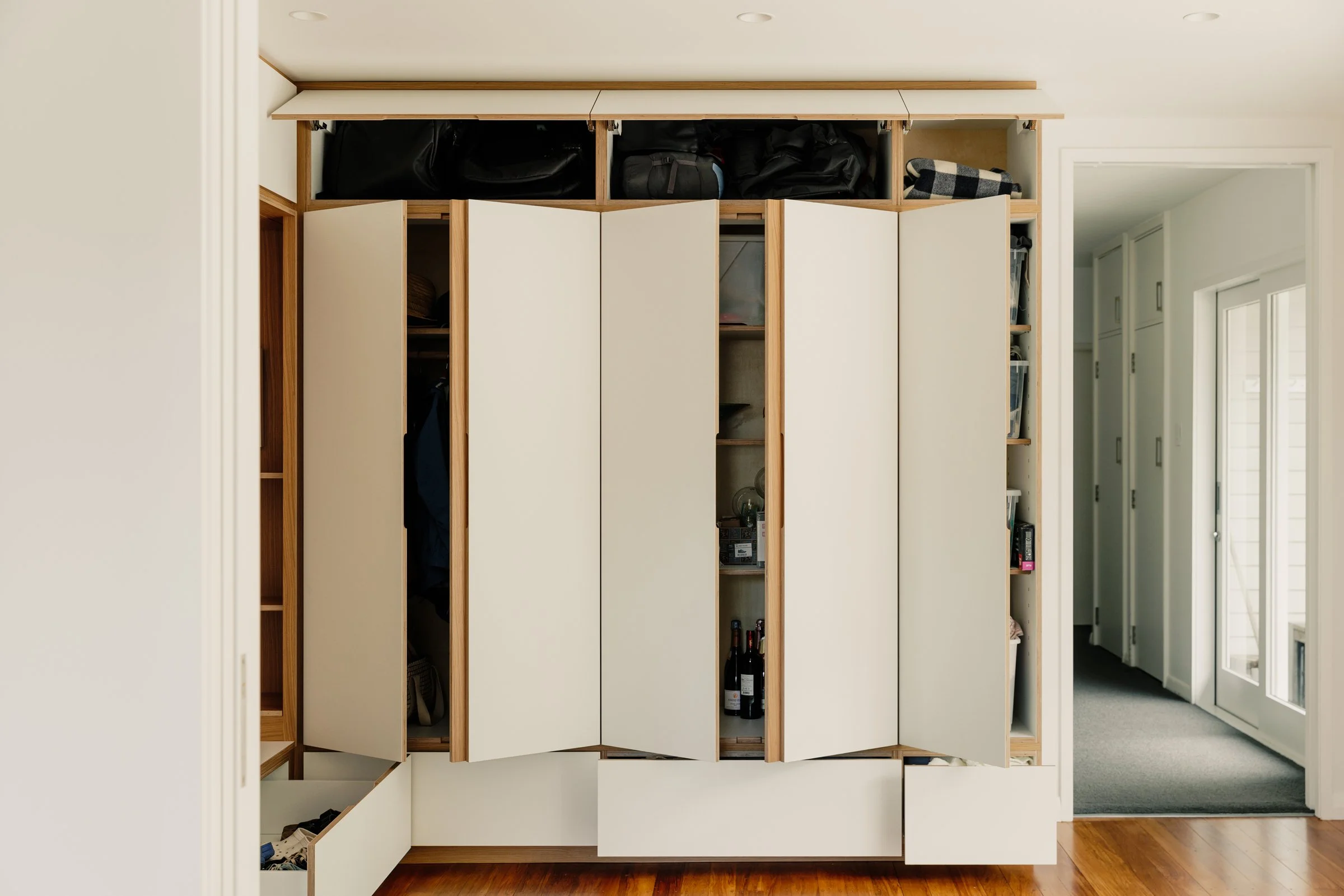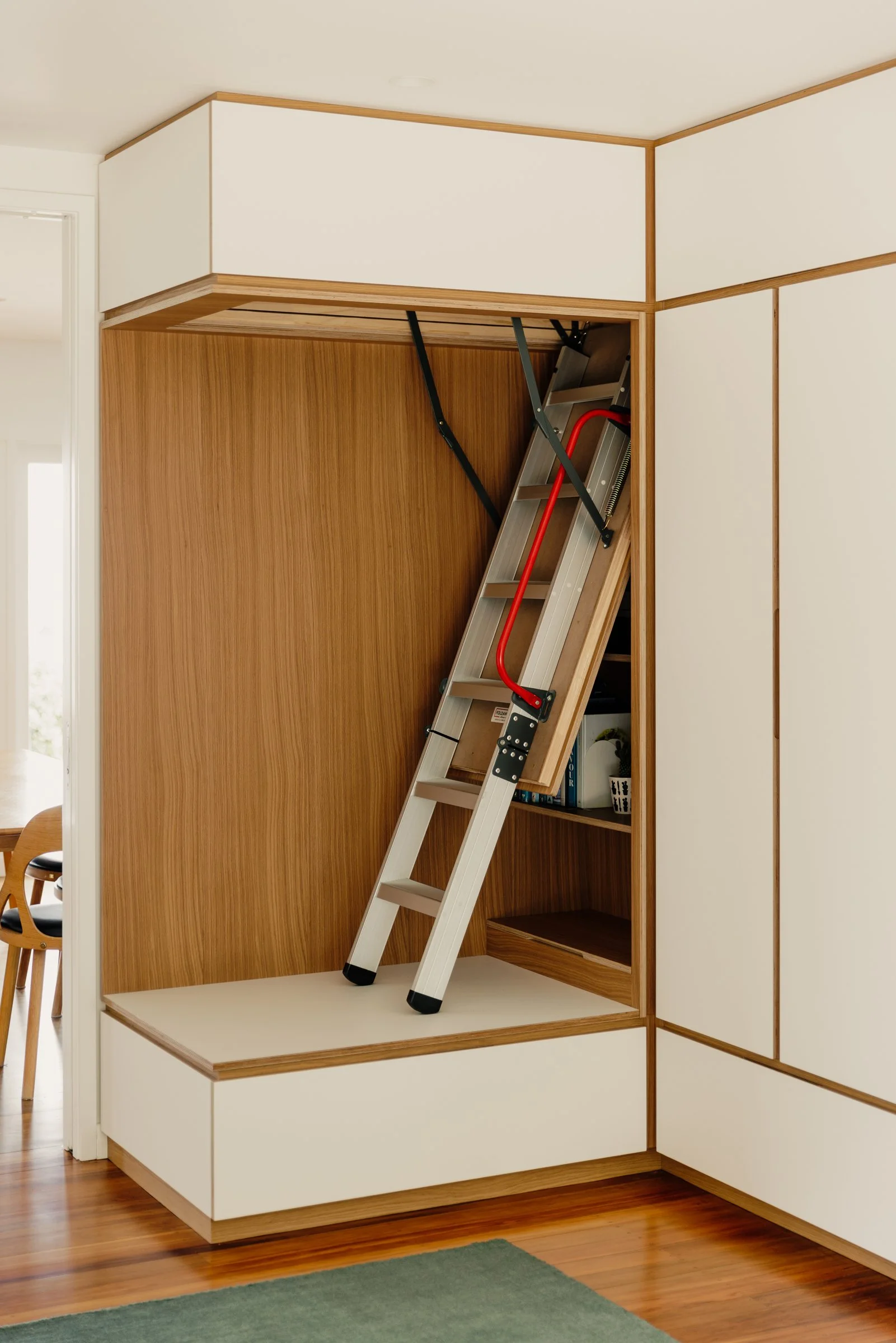 Choosing overlay style of joinery for the fronts ensures that the vast cabinet remains sleek and minimal but is actually an incredibly large storage cupboard. The integration of the pull down ladder makes accessing the roof area a breeze and completely disappears when not in use.