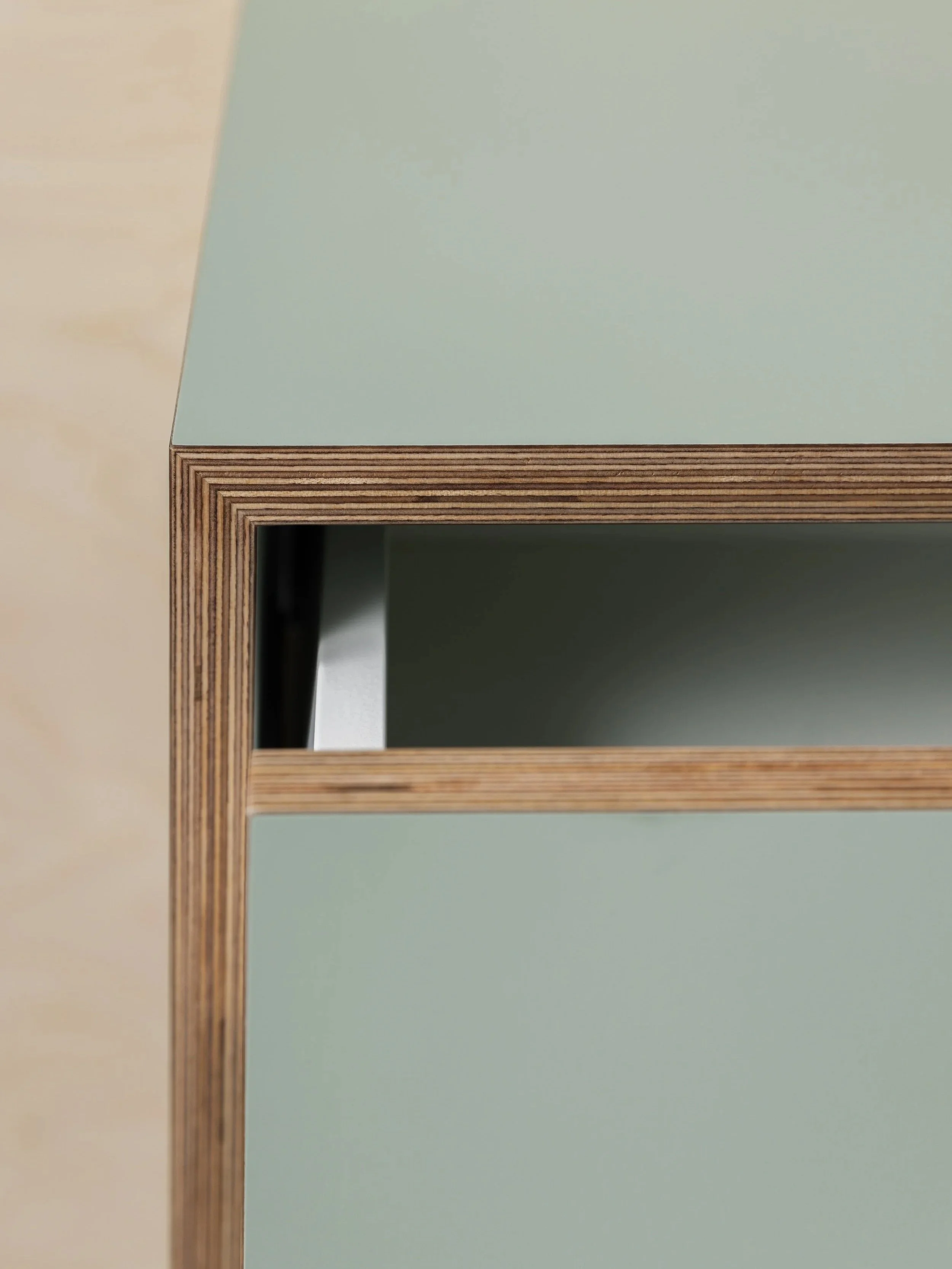 Crafted from Birch plywood and defined by its clean geometry, the piece retains the seamless mitred corners and quiet simplicity that characterise the range. Enhanced by an open shelf for everyday storage while maintaining the purity of the silhouette.